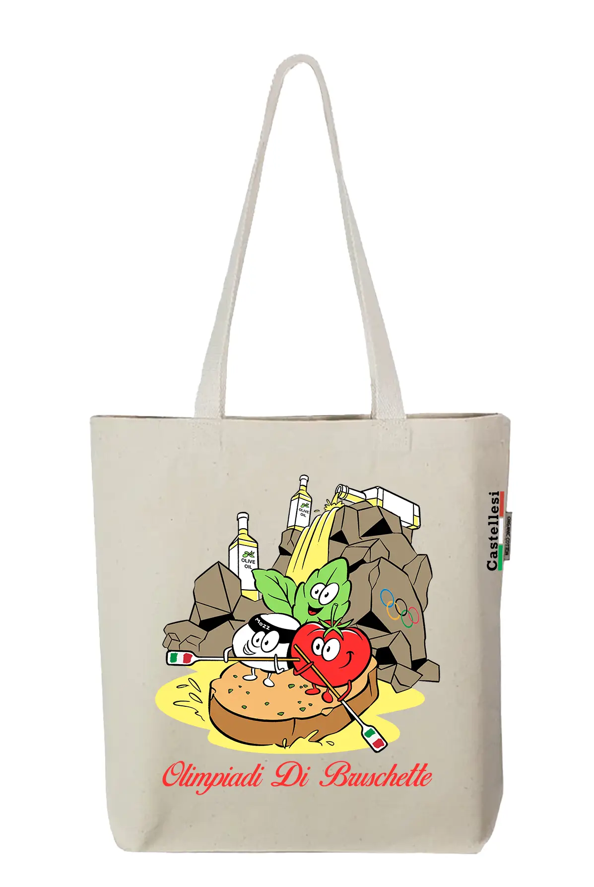 Celebrate Italian cuisine with the Castellesi Bruschette 100% Cotton Tote Bag! Featuring a fun Bruschette Olympics cartoon print, this eco-friendly, durable, and stylish tote is perfect for everyday use. Carry your essentials with humor and flair!