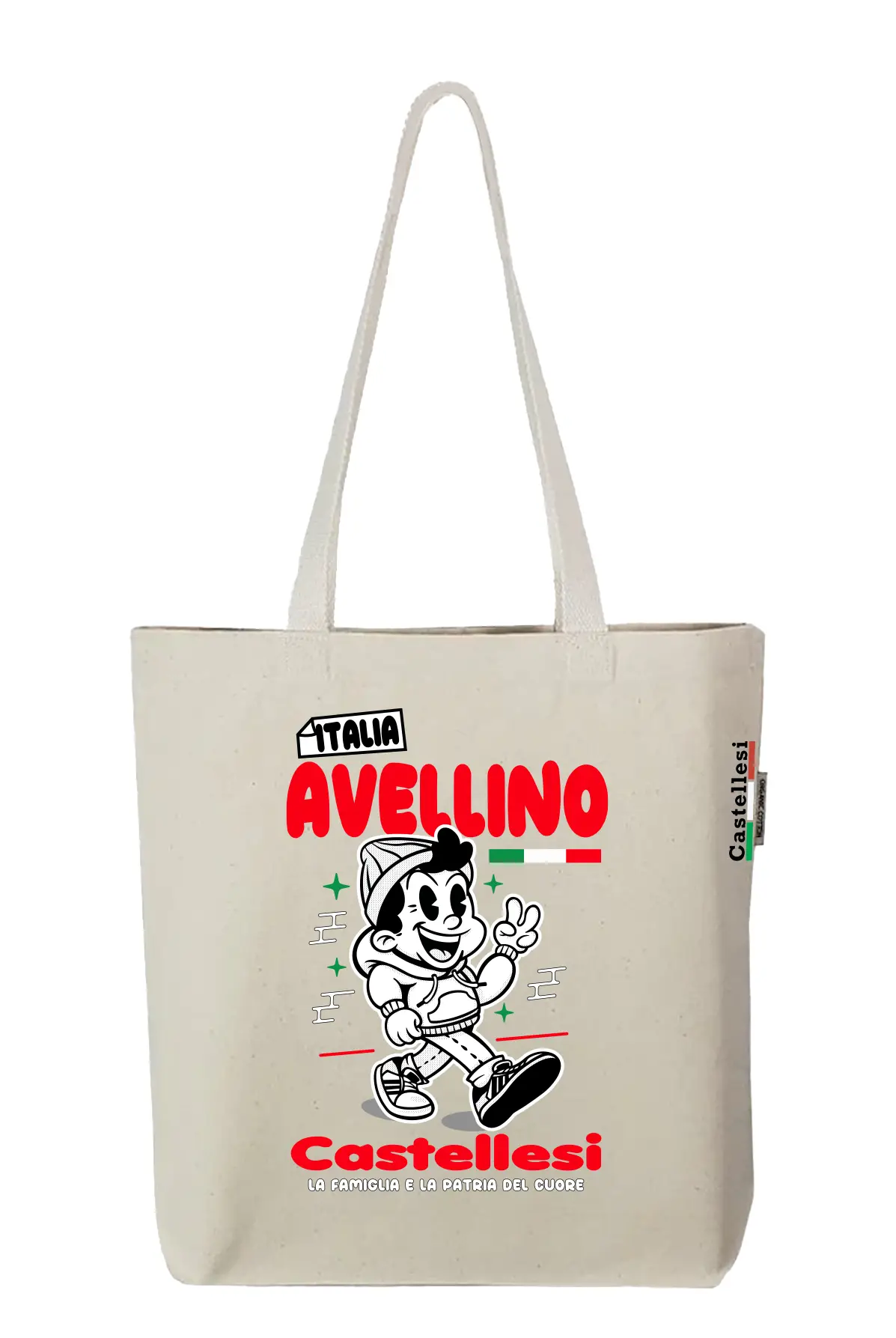 Celebrate family, heritage, and the love for Italy with the Castellesi Avellino “Cugino” Tote Bag! Made from 100% organic cotton, this high-quality tote features a lovable character alongside the heartfelt Italian phrase “La famiglia è la patria del cuore” (Family is the homeland of the heart). Whether you’re running errands, traveling, or simply showing off your Italian pride, this tote is the perfect companion.