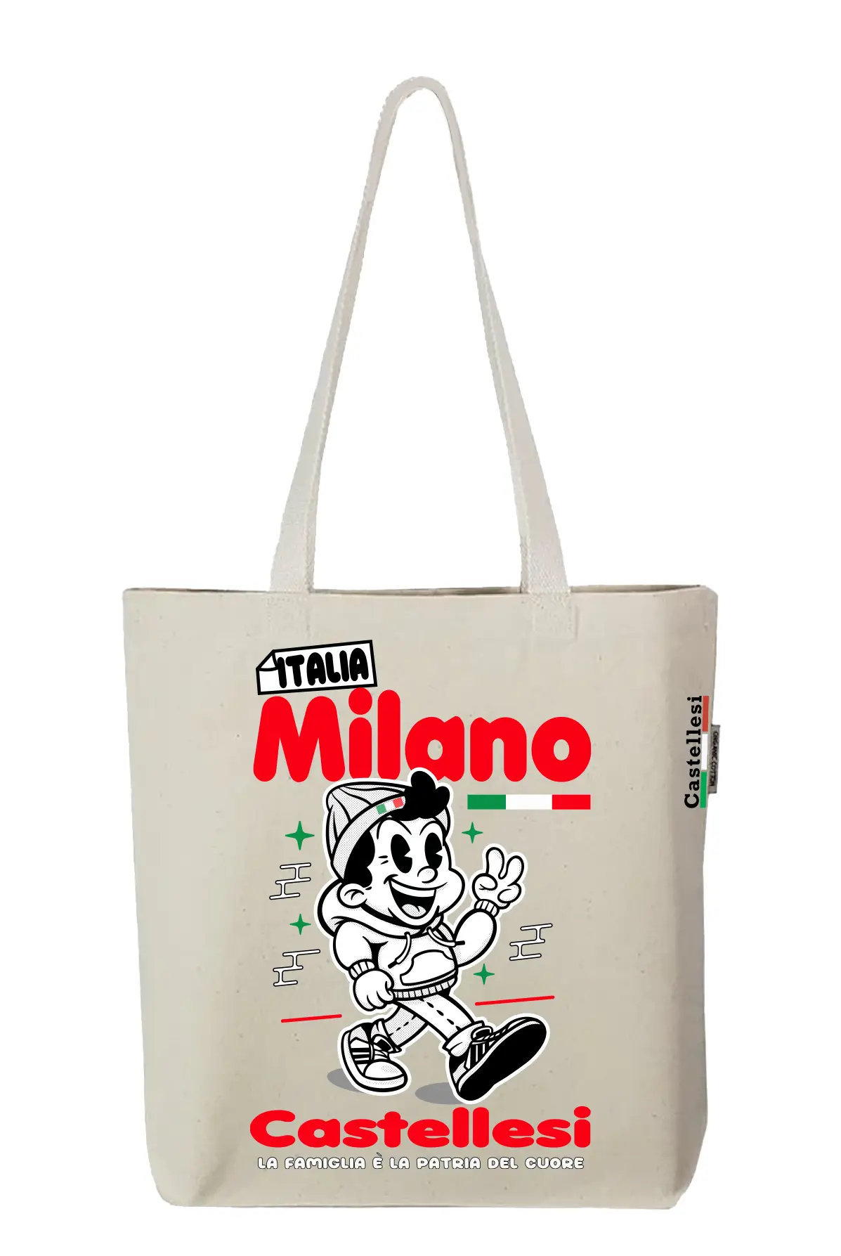 Celebrate family, heritage, and the love for Italy with the Castellesi Milano “Cugino” Tote Bag! Made from 100% organic cotton, this high-quality tote features a lovable character alongside the heartfelt Italian phrase “La famiglia è la patria del cuore” (Family is the homeland of the heart). Whether you’re running errands, traveling, or simply showing off your Italian pride, this tote is the perfect companion.